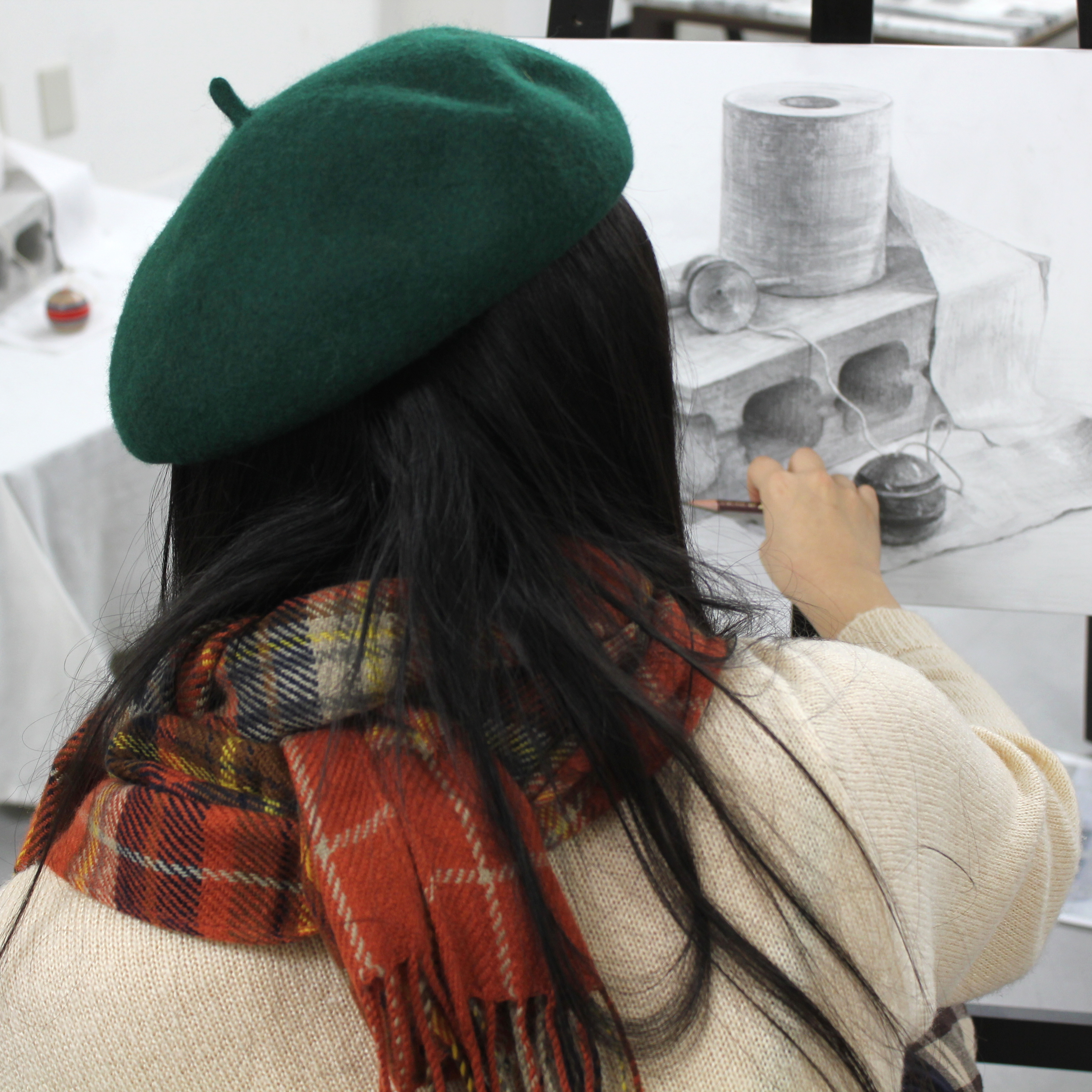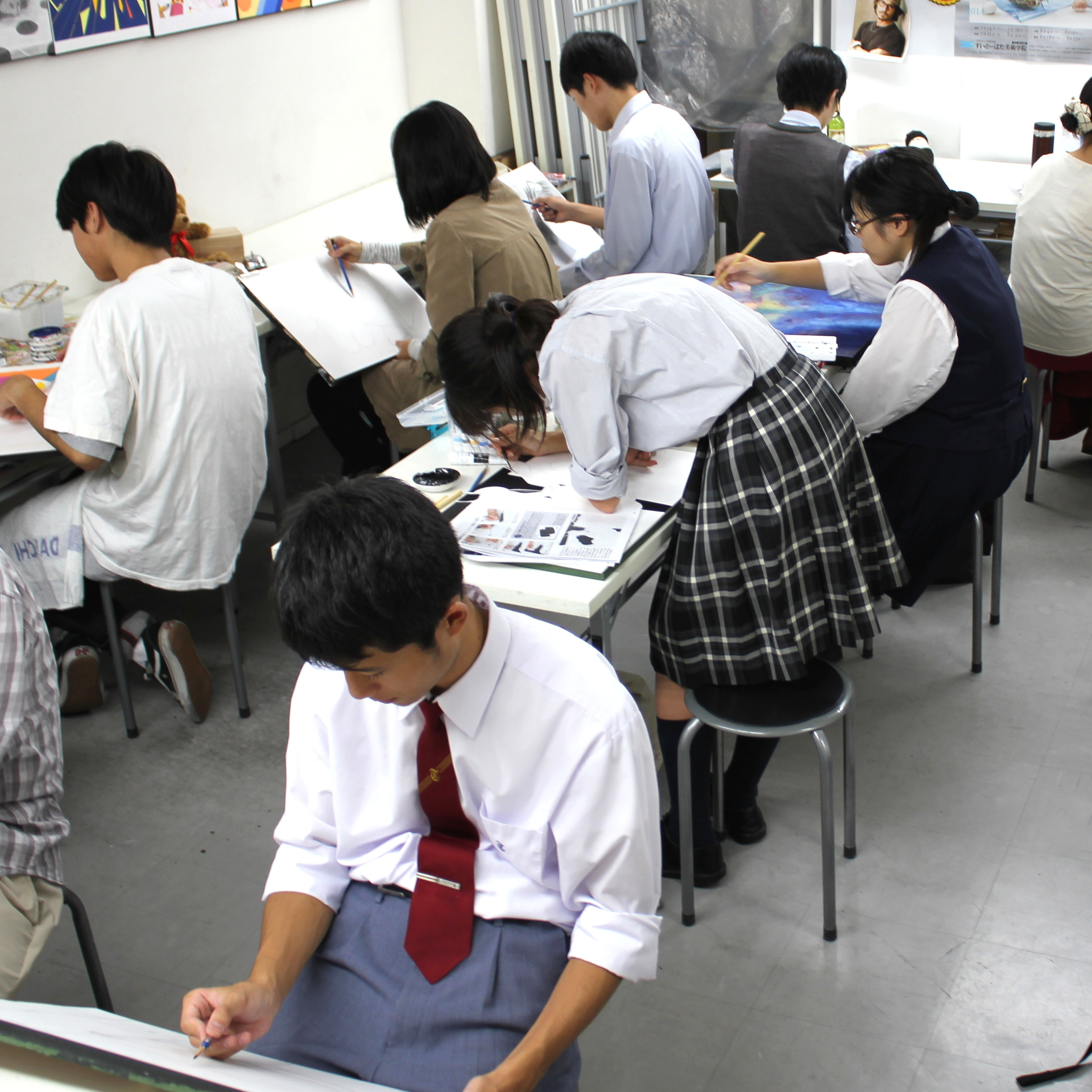 1学期は対象物を観察して描写する課題を中心に、受験の枠にとらわれず、様々な課題に取り組むことで、幅広い基礎力を養います。2学期は色彩感覚や構成力などを伸ばす課題に加え、自主制作も行うことでそれぞれの表現の方向性を見定めて行きます。3学期は受験生は受験直前期というかたちで行い、1・2年生は受験生の背中を観ながら将来の受験を見据え、少しずつ受験課題にも挑戦して行きます。
